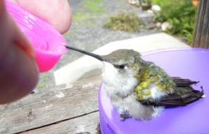 He needed to be in a position to feed without having to grip a perch. So I placed him on the porch railing and found a pink milk bottle top, filled it with nectar, and held it against his beak. Maybe the pink color would induce him to feed. Then, to give him more elevation, I placed him on a jar top so he could feed downward at a natural angle.
